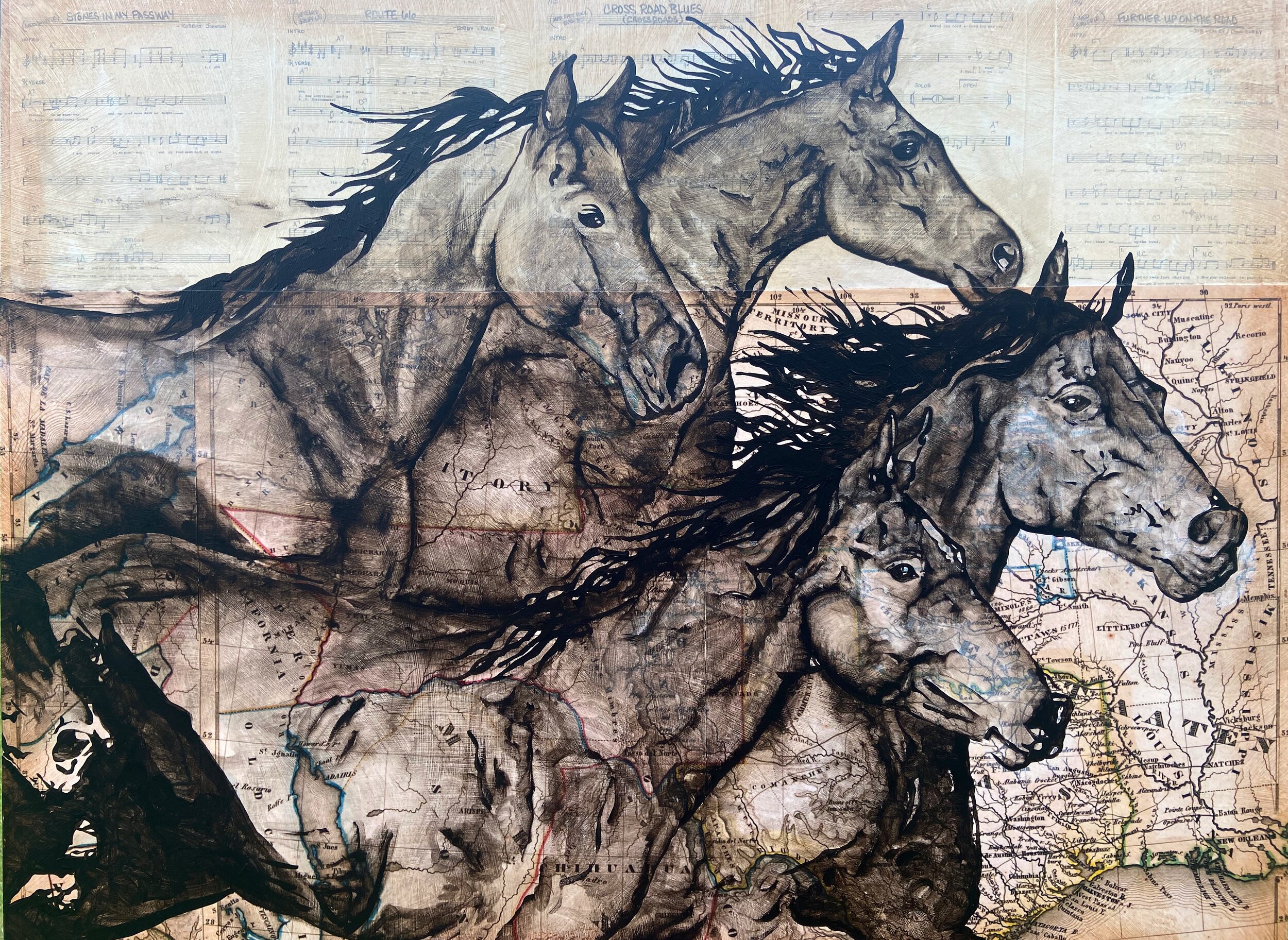 Will considers his work to be drawing, as each line is created by hand using a series of pens, and Chinese lettering quills. He works on a collage of vintage maps, show posters and sheet music. Every piece of ephemera incorporated into the work is part of the story telling process. Graphite, ink and acrylic might be used to finish the piece, ensuring that the artist's hands will never be clean.
